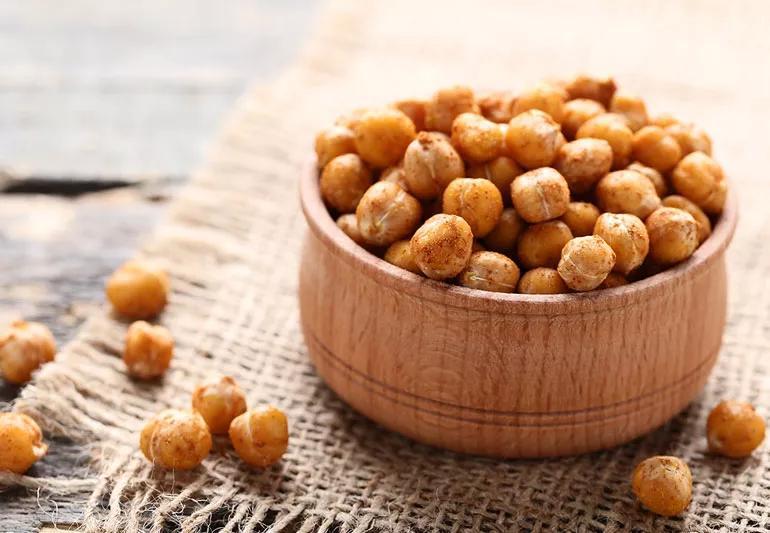 Rinse and drain a can of chickpeas well and then pat dry. Add one tablespoon of olive oil and a dash of cumin, chili powder, garlic powder and cayenne pepper. Mix well. Spread in a single layer on a baking sheet, then roast at 400 degrees Fahrenheit until crunchy, or about 20 minutes. One can of chickpeas makes 4 servings (120 calories per serving).