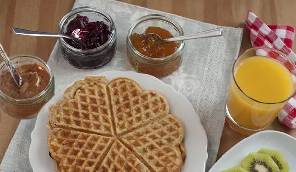 Spread one tablespoon of natural almond butter on one toasted or untoasted sprouted grain bread (or waffle) and a tablespoon of fruit preserves or sliced banana on another. Press the two slices together to make a sandwich. Enjoy with an 8-ounce glass of your desired milk — skim, 1%, soy or almond.