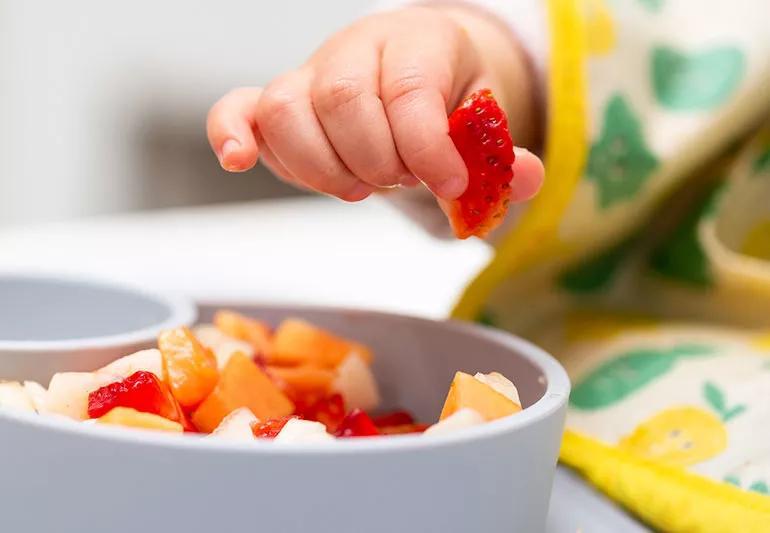 Make sure the protein is cut appropriately. Try ground meats, flaky fish, and scrambled or hard-boiled eggs. If you’re a vegetarian, you could offer tofu strips, hummus or mashed-up beans.