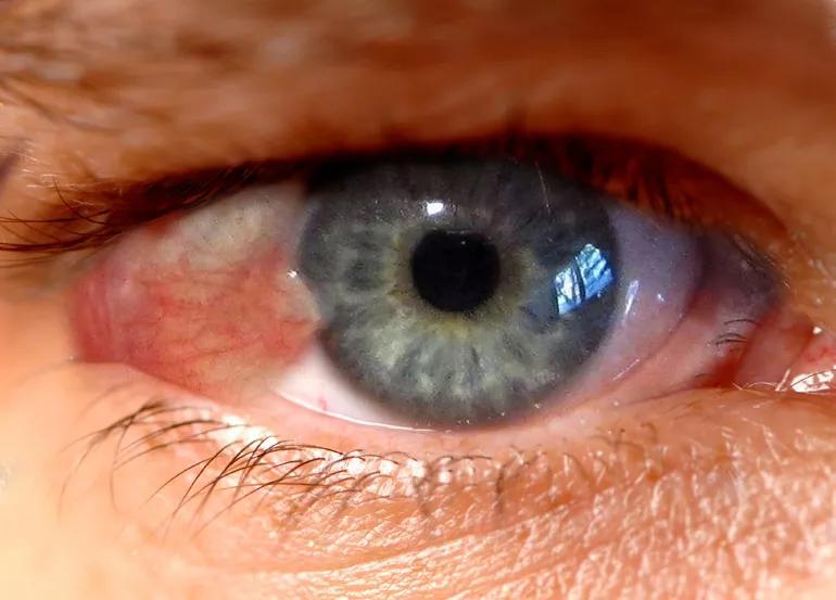 A pink or yellow bump on the white of the eye can indicate damage to the conjunctiva from too much sunlight exposure. “They can expand and grow further in and eventually block your vision,” Dr. Stalker explains. Invest in a good pair of sunglasses that offer full UV protection and cover your eyes completely.