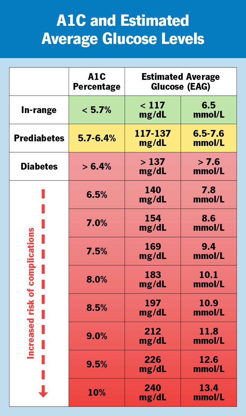 For example, an A1C level of 7% equates to an eAG of 154 mg/dL (8.6 mmol/L). An A1C level of 9% equates to an eAG of 212 mg/dL (11.8 mmol/L).
