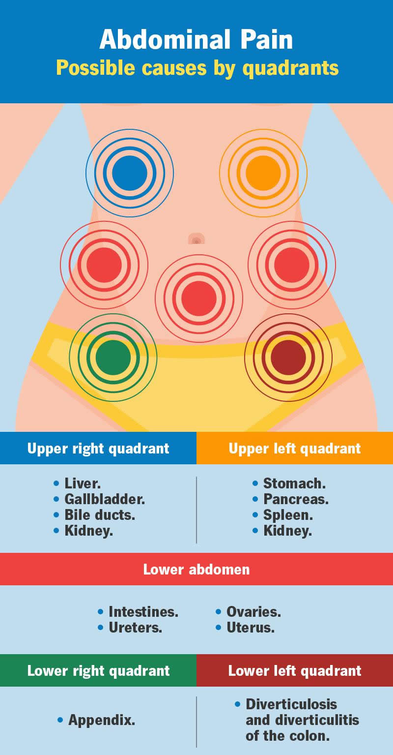 Sometimes abdominal pain indicates a serious medical condition that will require treatment. Pain in different regions may indicate different organs are involved. For example: