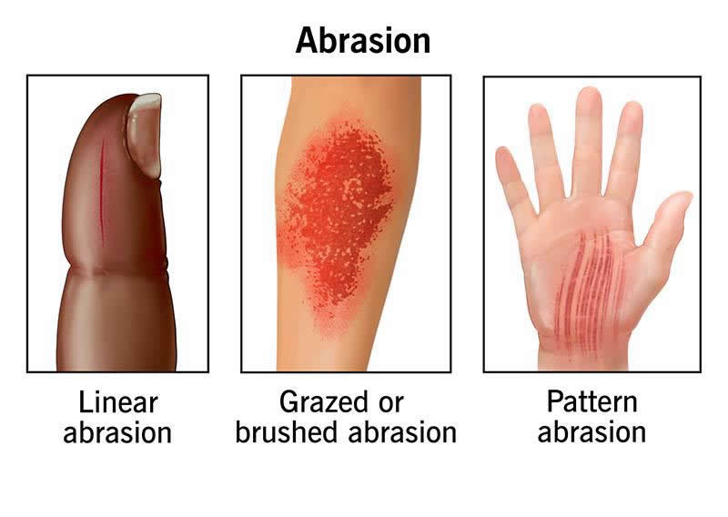 - Patterned: A patterned abrasion is skin damage caused by an object forcefully making direct contact with your skin and rubbing against it. The wound on your skin matches the size and shape of the object that your skin touched. An example is the nail markings caused by a cat scratch. The feline’s claws reflect the size and shape of wounds they make on your skin.