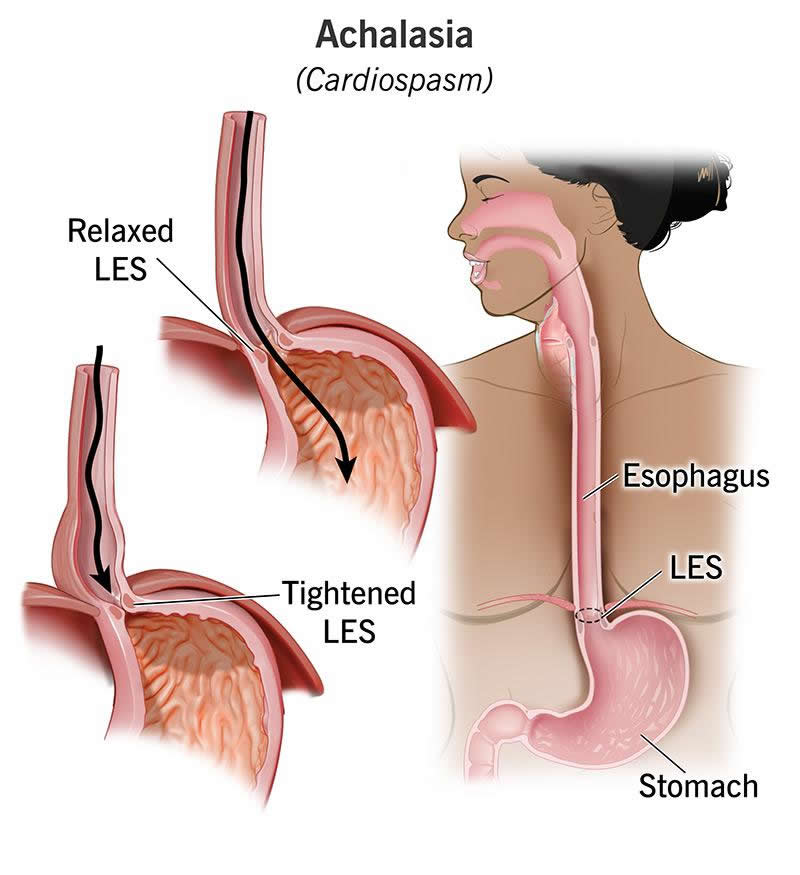Achalasia (cardiospasm) is a rare condition that happens when food and liquid doesn’t move through your esophagus to your stomach. Achalasia symptoms include trouble swallowing, heartburn and chest pain. It may cause complications like aspiration pneumonia. Treatment includes surgery and non-surgical options like medication and Botox injections.