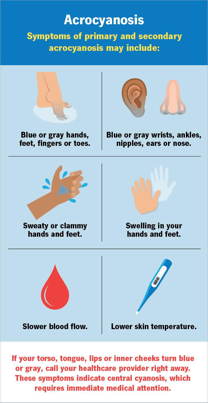 The outlook for secondary acrocyanosis depends more on the underlying health condition. It can be serious for some people. If you develop symptoms of acrocyanosis, tell your healthcare provider. They can determine whether you have another condition that’s causing it.