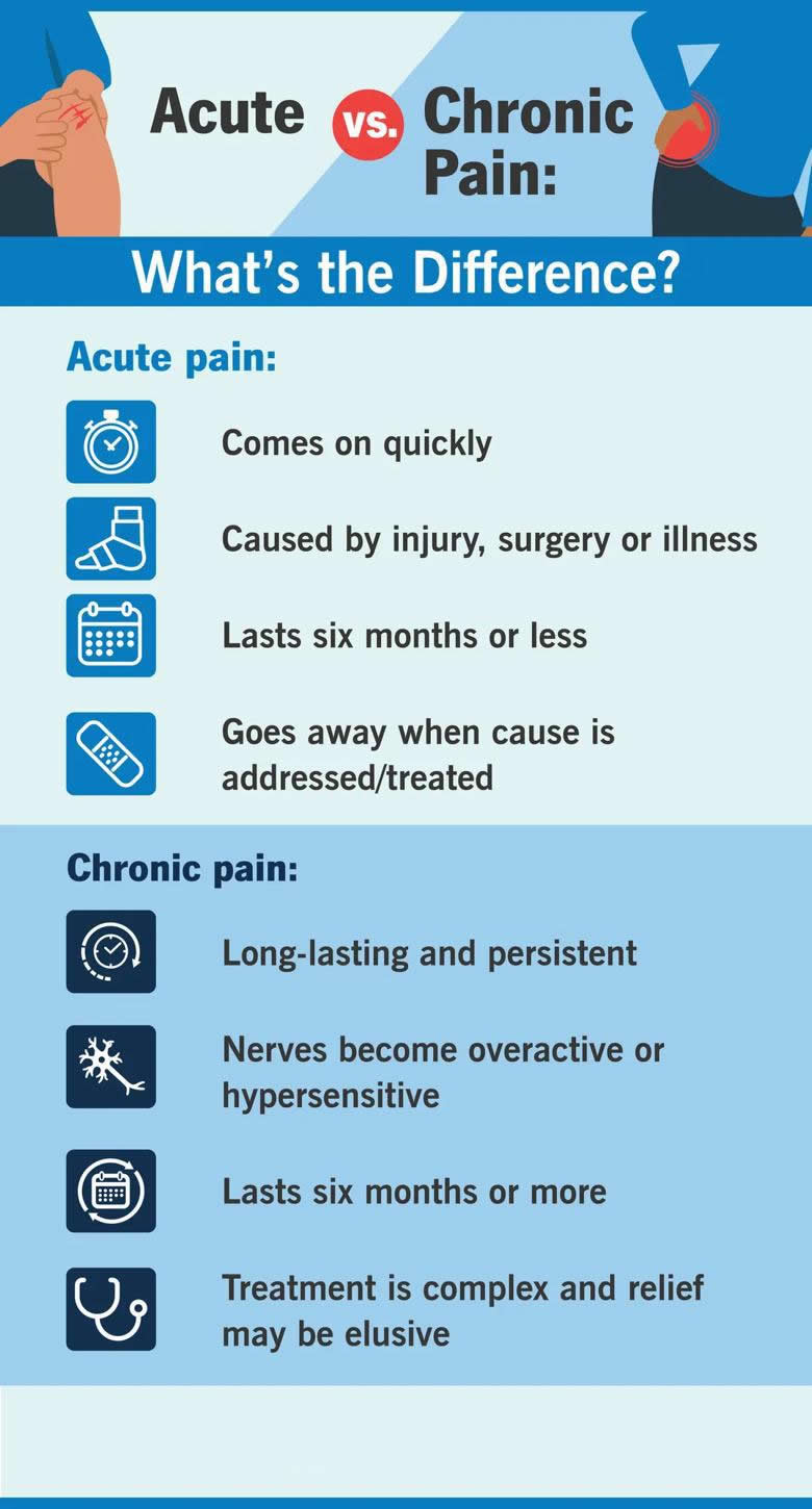 Acute pain goes away with treatment, while chronic pain is long-lasting and can be complex to manage