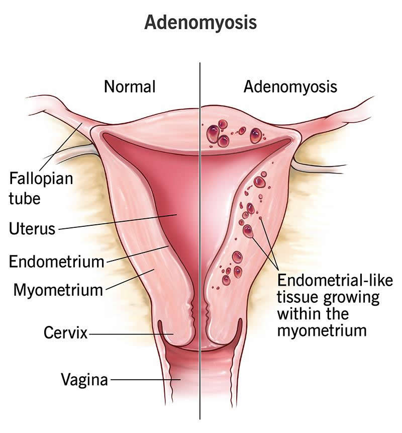 Adenomyosis (pronounced “add-en-o-my-OH-sis”) is when tissue similar to the lining of your uterus (endometrium) starts to grow into the muscle wall of your uterus (myometrium). It causes your uterus to thicken and enlarge — sometimes, up to double or triple its usual size. Adenomyosis can cause painful periods, heavy or prolonged menstrual bleeding with clotting and abdominal/pelvic pain.