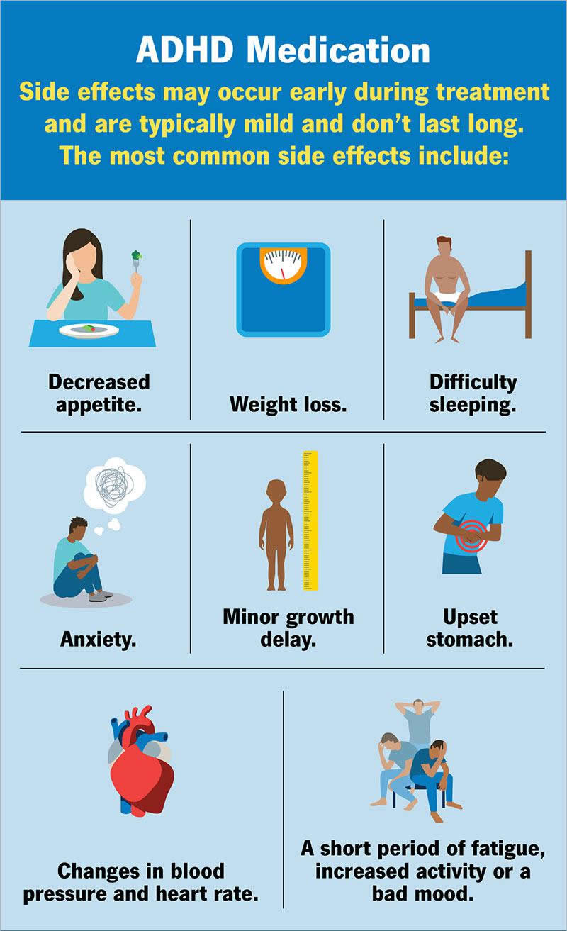 Side effects may occur early during treatment with ADHD medication. These side effects are typically mild and don’t last long. They may resolve after a few weeks of treatment as your body adjusts to the medication. Rarely, they can be more severe or last longer. The most common side effects of ADHD medications include: