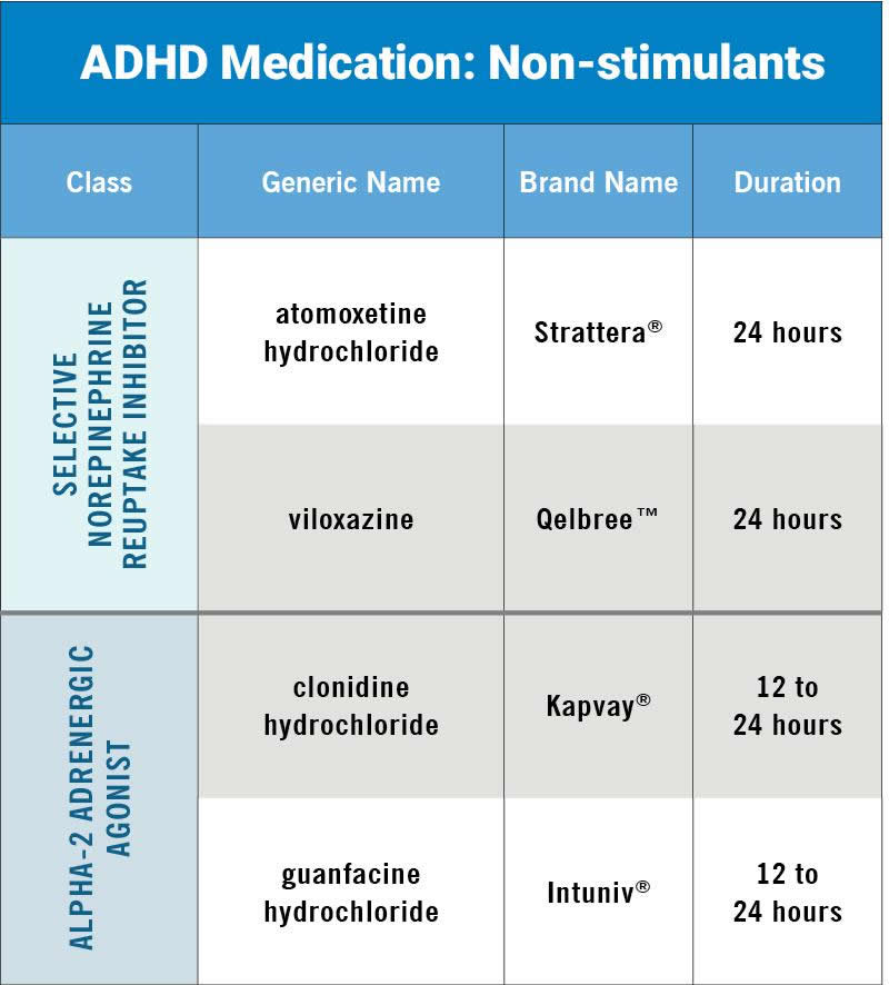 The chart below shows the class, generic name, brand name and duration of each FDA-approved non-stimulant ADHD medication.