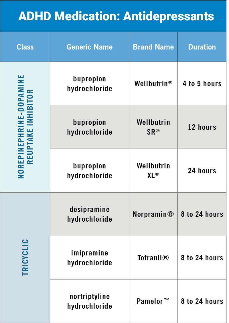 The chart below shows the class, generic name, brand name and duration of certain antidepressants that may help treat ADHD.