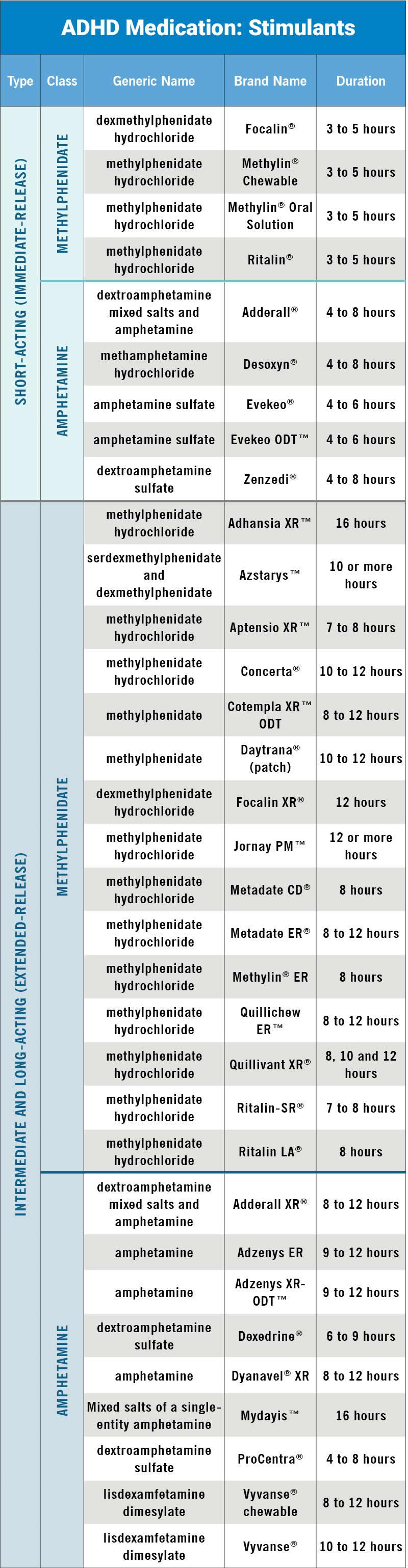 The following list contains the names of ADHD medications approved by the FDA. The chart shows the type, class, generic name, brand name and duration of each stimulant ADHD medication.