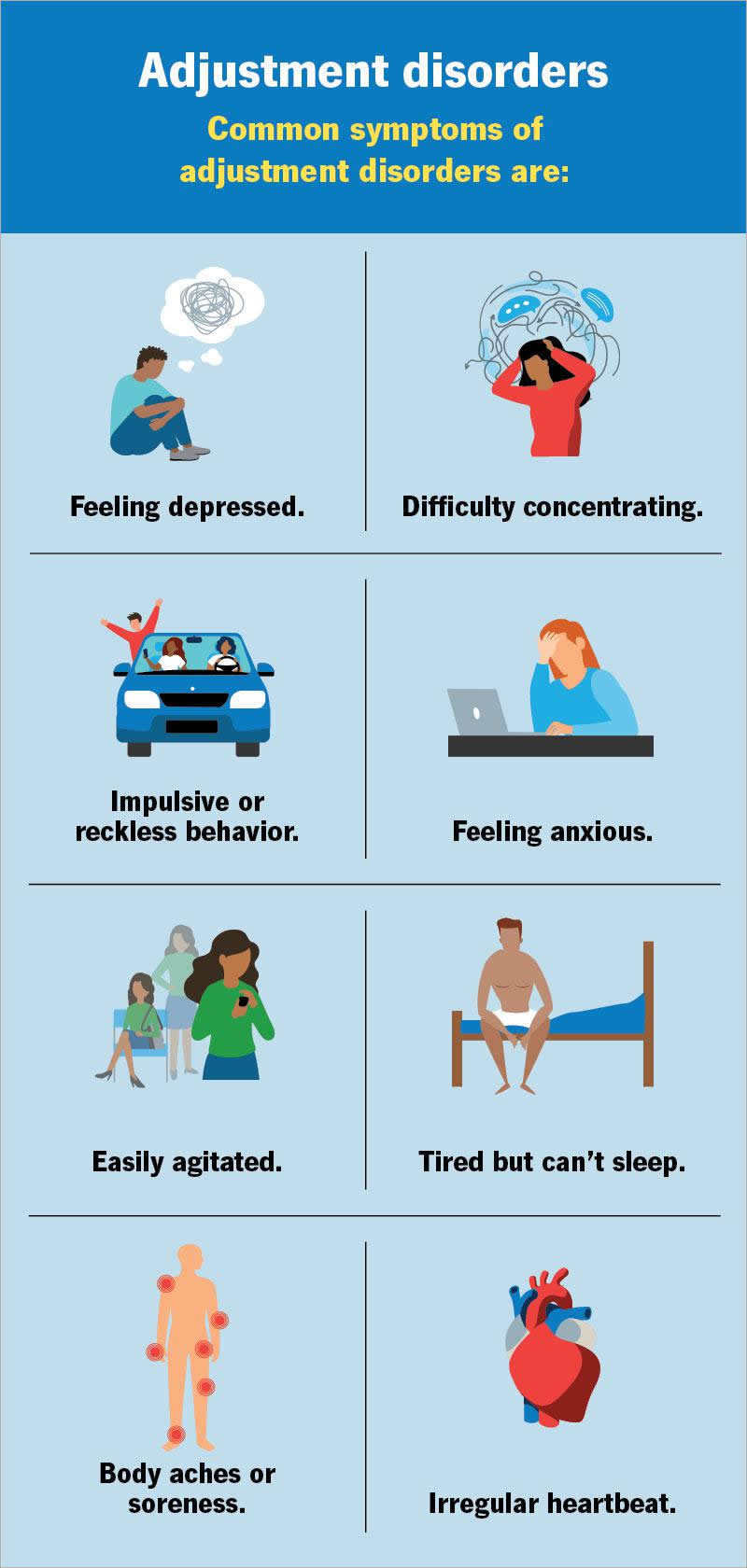 Life is full of ongoing and unpredictable challenges. Both bad and good experiences can cause excessive stress that leads to adjustment disorders. It helps to have the support of loved ones and healthcare providers who you can lean on when things become too stressful. Therapy and medications can help you get back to feeling like yourself. Don’t be afraid to reach out for help when you need it. If you have suicidal thoughts, call for help immediately: 988 (Suicide and Crisis Lifeline). Help is always at your fingertips.