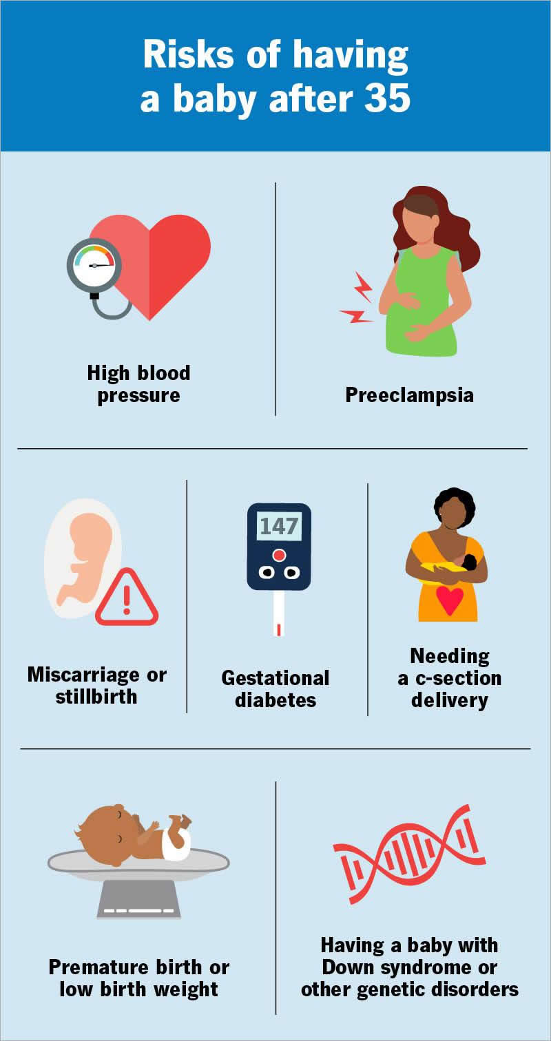 Many women over 35 have healthy pregnancies and babies. But there is a greater risk of certain complications and health conditions. Some of those are: