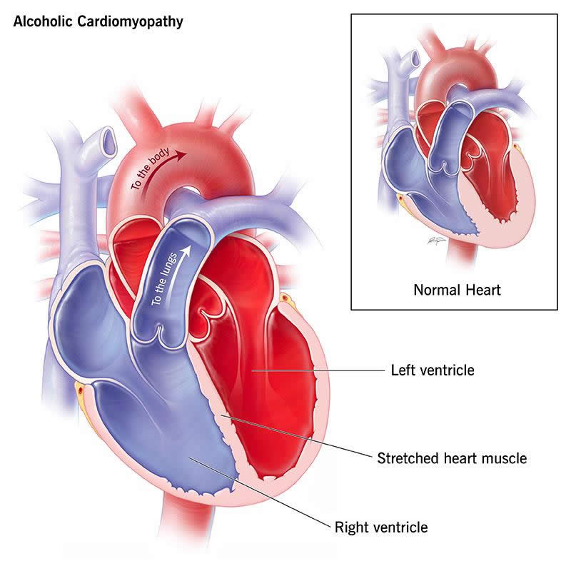 Alcohol-induced cardiomyopathy is a condition where consuming too much alcohol damages your heart. This damage happens because parts of your heart stretch and enlarge. That weakens your heart muscle, keeping it from pumping as well as it should. Over time, this means your heart can't pump blood as effectively, which reduces your body's available oxygen supply.