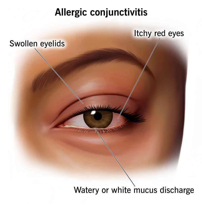 Allergic conjunctivitis is when allergens cause inflammation in the tissue that lines your eyelids and the whites of your eyes. Common causes include pollen, dust and pet dander. Symptoms include red, itchy, swollen and watery eyes. Treatment includes antihistamine medications and eyedrops.