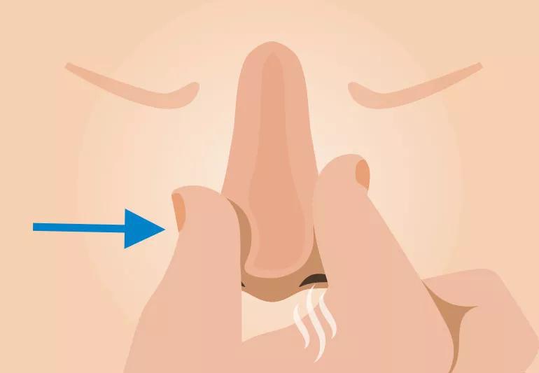 - Bring your right hand up to your nose, with your index finger hovering over your left nostril and your thumb hovering over your right nostril.