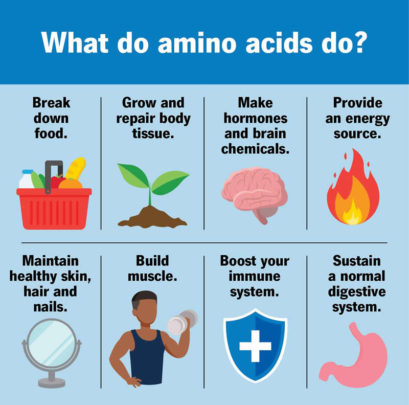 Your body uses amino acids to make proteins. The different types of amino acids and the way they’re put together determine the function of each protein. So, amino acids are involved in many important roles in your body. Amino acids help: