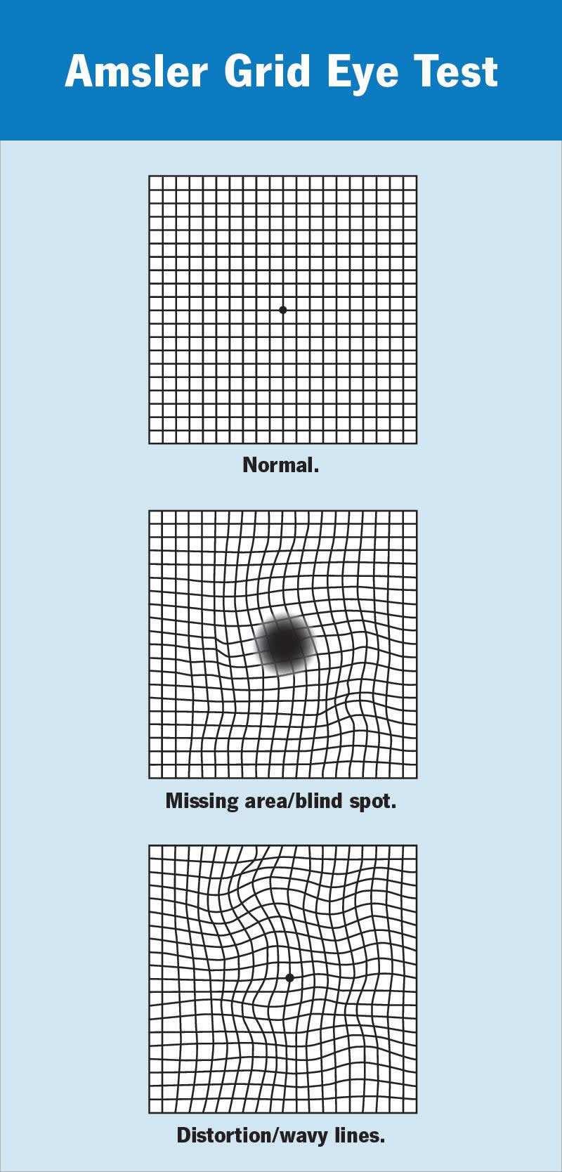 The Amsler eye grid test can help with diagnosing and monitoring any condition that could distort the surface of the macula. That includes: