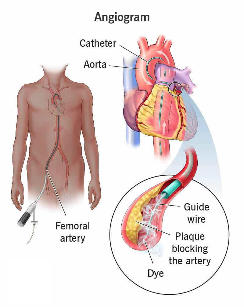 An angiogram procedure involves injecting contrast material (dye) that your provider can see with an X-ray machine. Images on a screen show blood flow and blockages in your blood vessels.