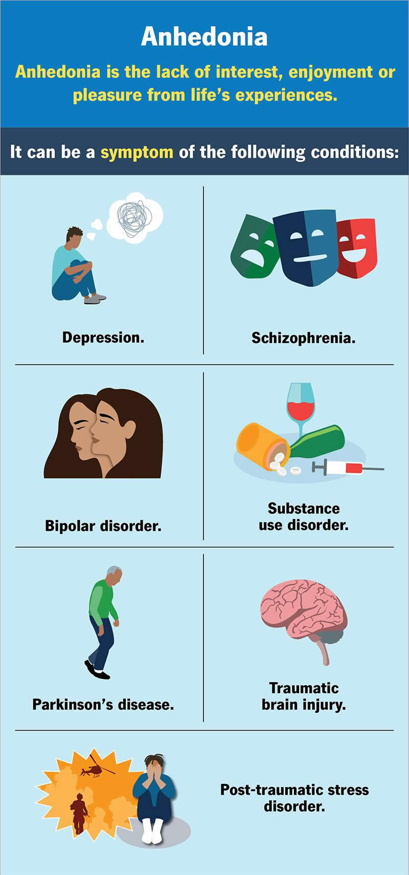 Anhedonia is the inability to experience joy or pleasure. You may feel numb or less interested in things that you once enjoyed. It’s a common symptom of many mental health conditions like depression. Treatment is available to help you regain interest in life’s activities, like being around loved ones or listening to music.
