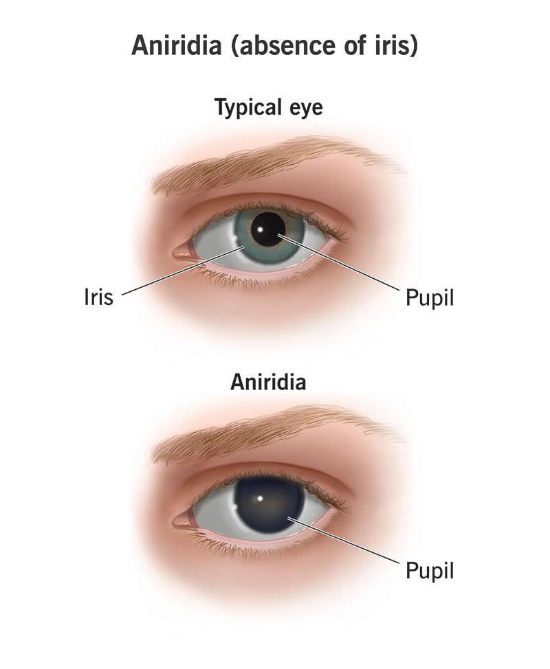 Aniridia is a condition that causes babies to be born without irises (the colored part of your eye). Some babies are missing their entire irises. Others only have part of an iris in each eye.
