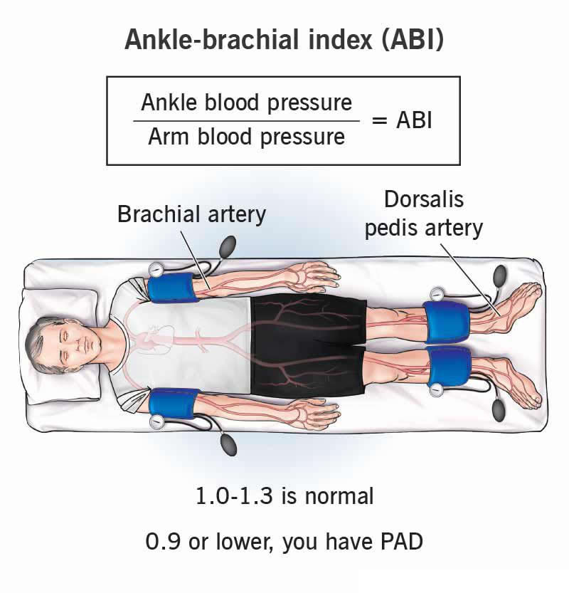 An ankle-brachial index (ABI) test is a quick, noninvasive way to know if you have peripheral artery disease (PAD). This test compares blood pressure in your arms versus your ankles. If your ankle pressure is lower than your arm pressure, it means blood isn’t flowing as well in your legs and you likely have PAD. Your provider will recommend treatment.