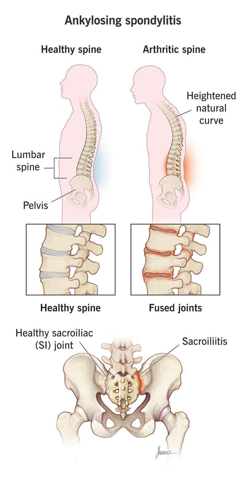 Ankylosing spondylitis (AS) also affects the joints where the base of your spine meets your pelvis (your sacroiliac joints). Your sacroiliac joints are the connection between your spine and pelvis. Specifically, they’re the place where the sacrum (the triangle-shaped last section of your spine) meets the ilium (the top and back part of your pelvis).