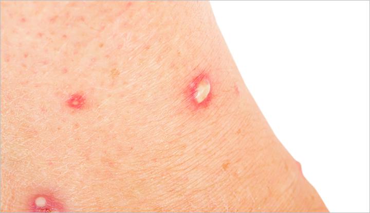 The bite from an ant can look like a single pimple and a bite from a bed bug causes small red elevated bumps in a linear pattern on your skin. Both types of bites cause itching.