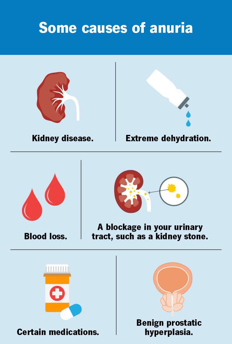 Anuria happens when your kidneys don’t have enough blood or fluid. Conditions that may affect your blood or fluid levels include: