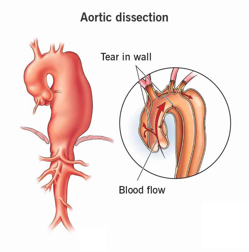 Aortic dissection is a tear in the inner layer of a weak area of your aorta. Blood going through the tear splits your aorta’s layers. Your aorta is the main artery that delivers oxygen-rich blood to your body. Aortic dissection is a life-threatening condition that requires immediate care. Treatment includes several types of surgery and medication.