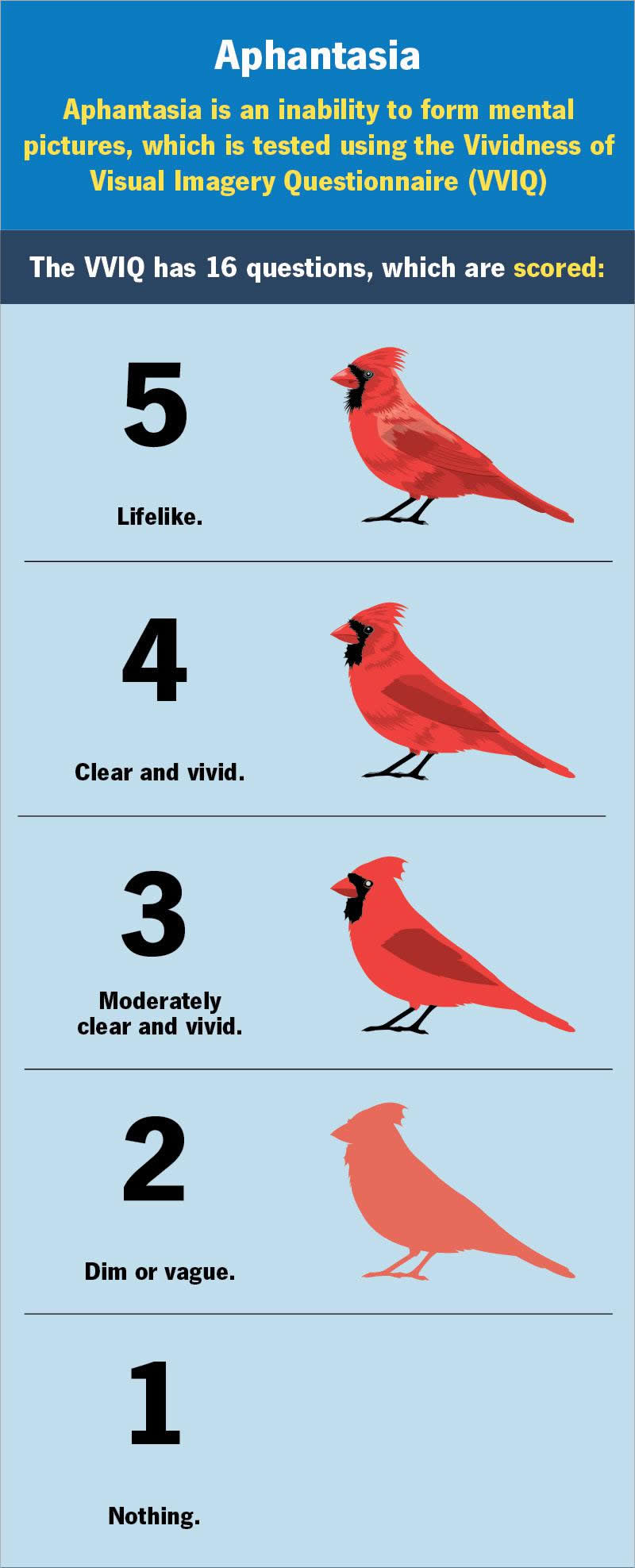 Someone with a VVIQ score of 16, meaning total aphantasia, can’t form any mental images. Some who have this degree of aphantasia describe it like being blind or having their eyes closed.