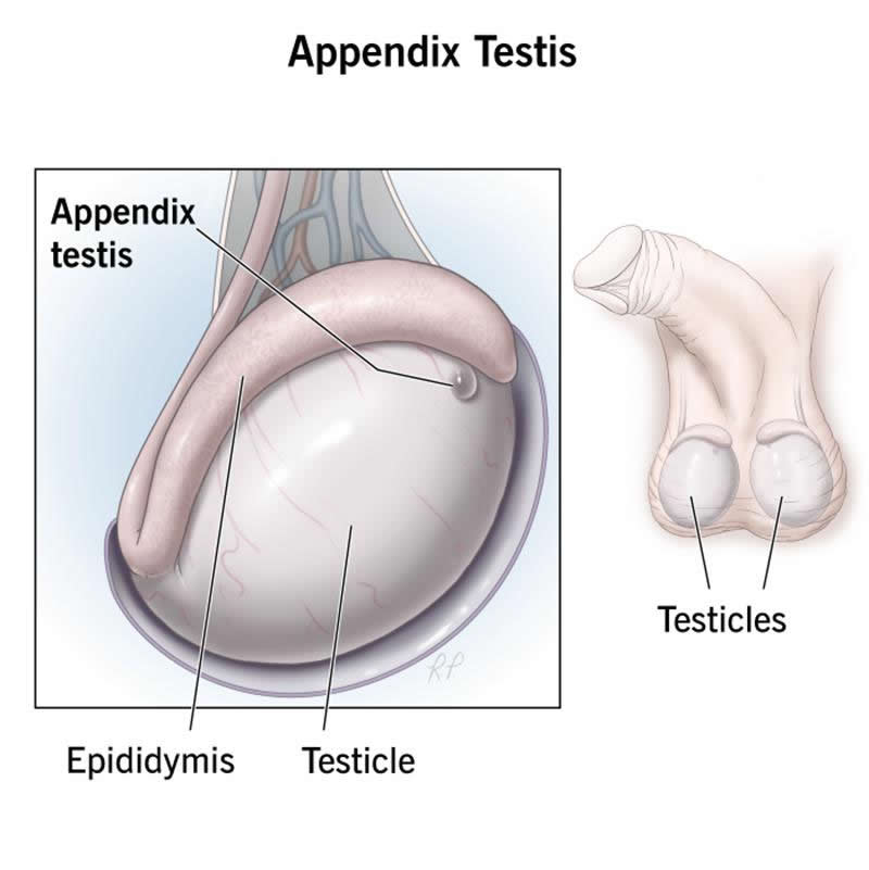 An appendix testis is a normal but functionless piece of tissue that may be on one or both testes. The tissue is left over from a duct that’s part of an embryo’s development. It usually doesn’t cause any problems. But it may twist and cause sharp pain. Treatment usually includes rest, ice and pain medications.