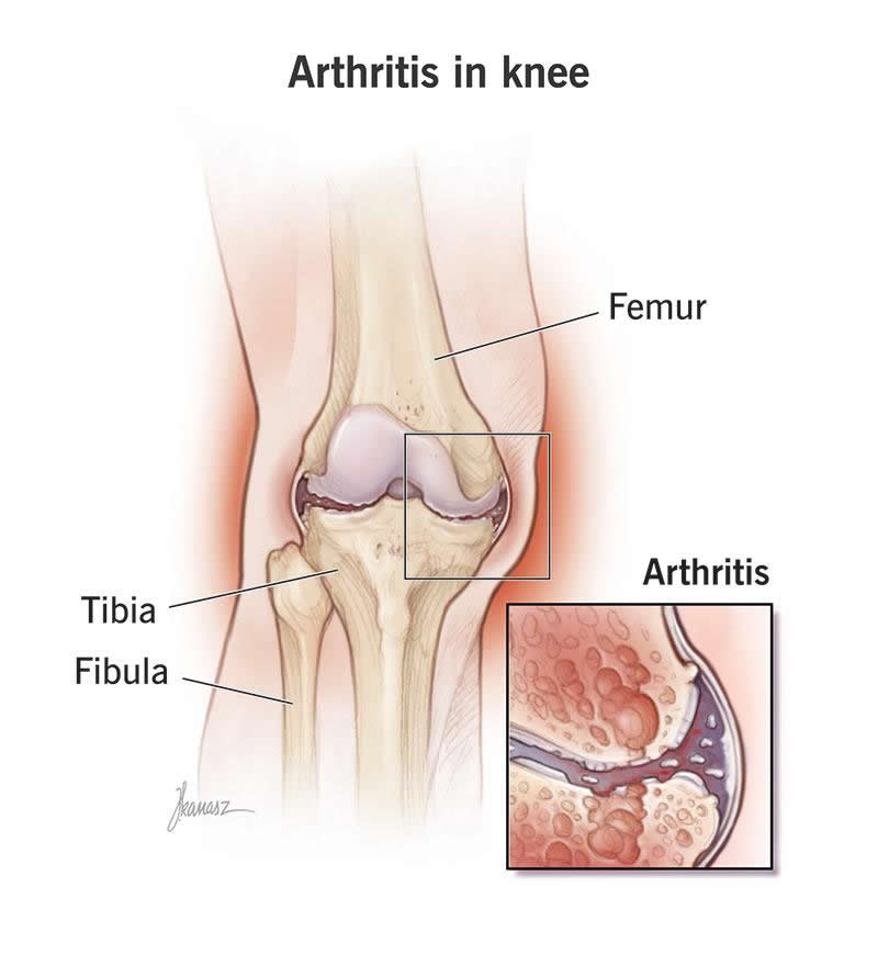 Different types of knee arthritis have different root causes, but they all lead to the same end. Inflammation in your joint tissues causes pain and swelling. Damage to the cartilage in your joint makes things worse. Cartilage is what cushions the bones in your joints and allows them to move smoothly against each other. When the cartilage wears away, you're left with bone grinding against bone.