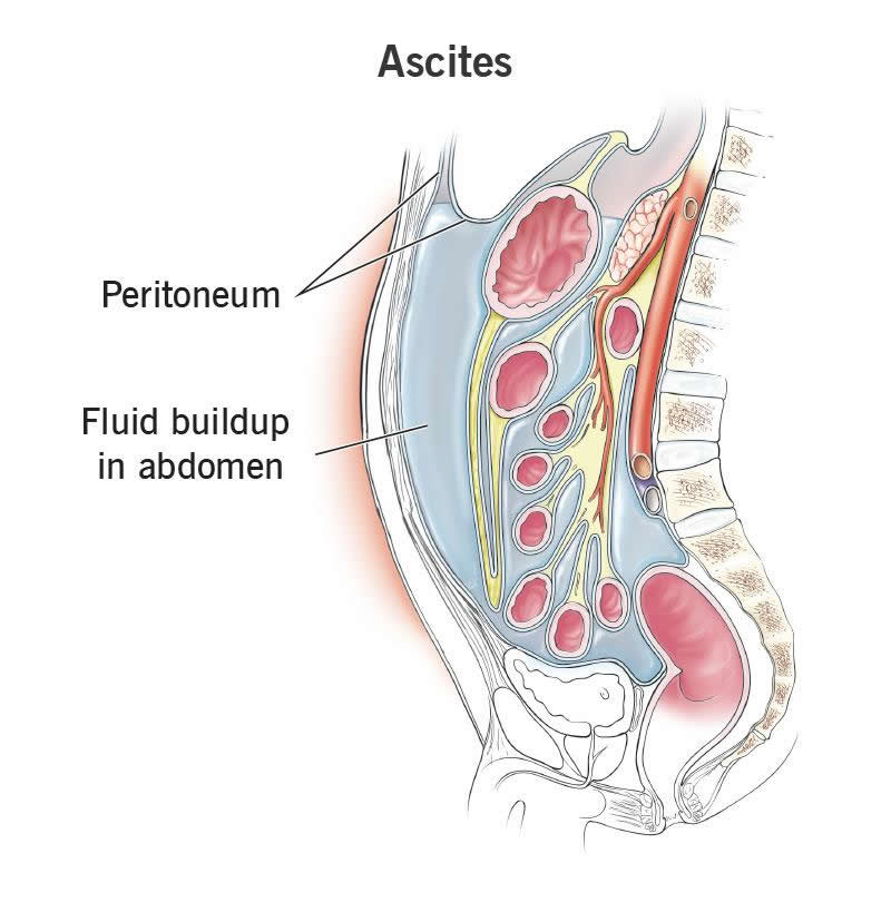 A sheet of tissue called the peritoneumcovers your abdominal organs, including your stomach, intestines, liver and kidneys. The peritoneum has two layers. Ascites happens when fluid builds up between the two layers. The fluid can make it look like you have a watermelon or basketball in your belly.