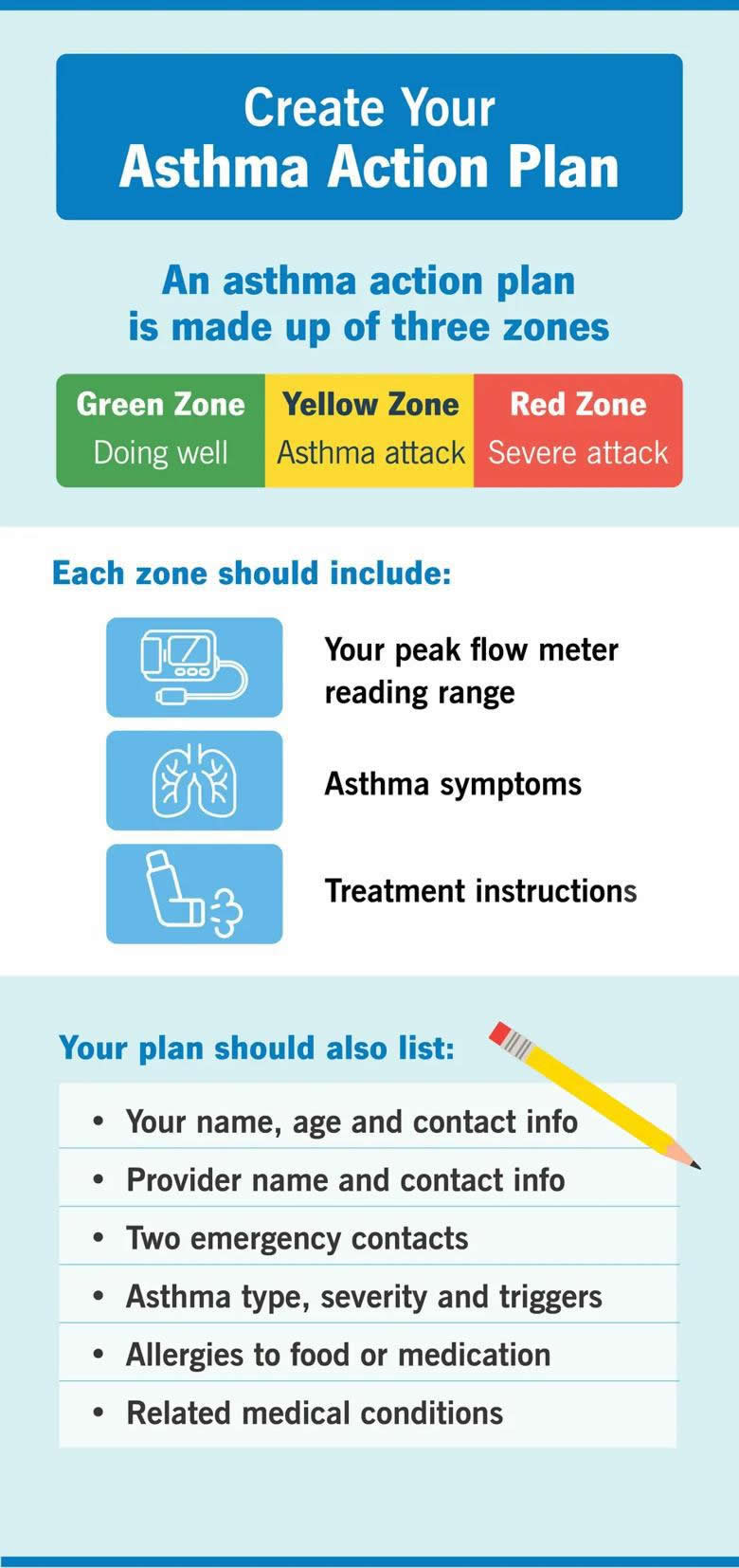 An asthma action plan is built with the help of your provider and is broken into three different categories or zones. They’re color-coded to help readers figure out the steps they need to take to best help you.