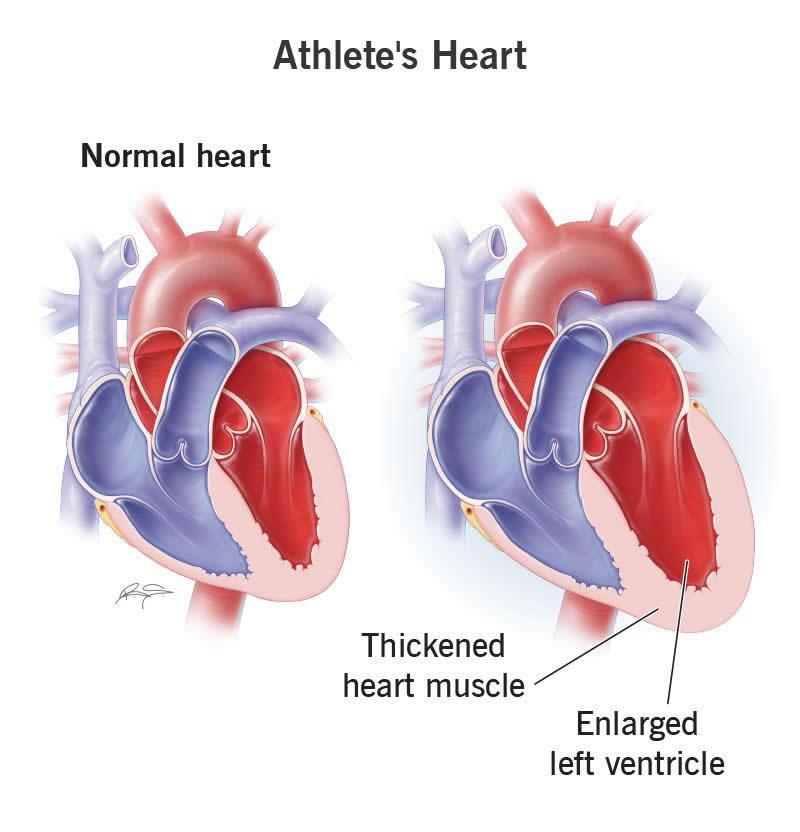 Athlete’s heart describes differences in your heart’s left ventricle and other changes that happen when you exert yourself for an hour a day on most days of the week. Your provider can pick up unusual heart sounds through a stethoscope or testing. However, this is a harmless condition with no symptoms.