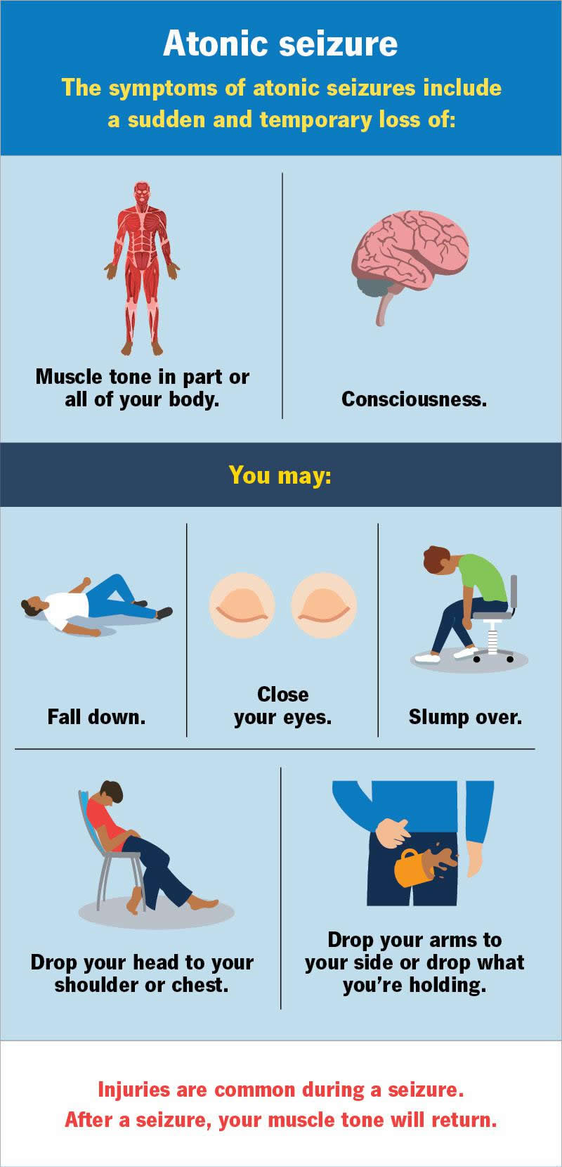 While these seizures often show up unannounced, a healthcare provider can help you keep them away. Your treatment plan will be specific to you and your body’s needs. Let your healthcare provider know if you have any questions about atonic seizures and how to stay safe.