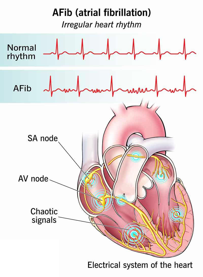 AFib (atrial fibrillation) is an irregular heart rhythm that begins in the upper chambers of your heart. With AFib, your heart’s electrical system doesn’t work as it should. Instead of sending electrical signals in a steady pattern, it sends many different signals at the same time.