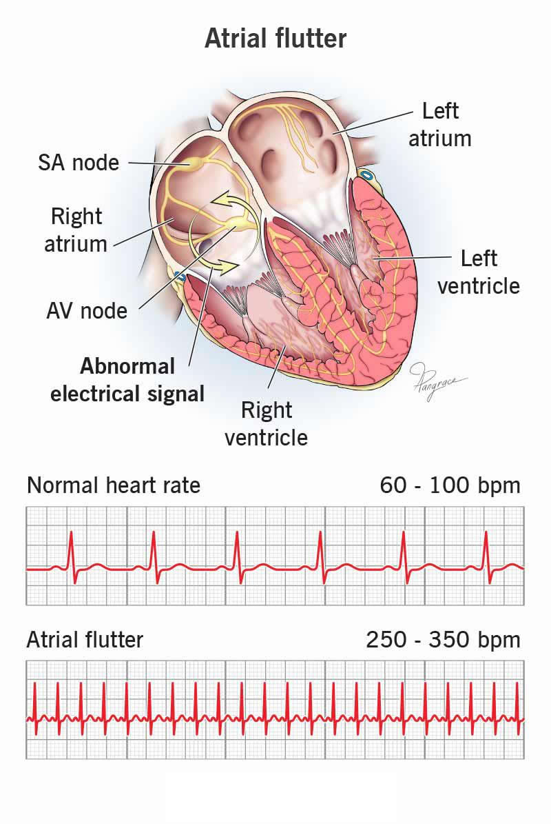 Atrial flutter is a type of abnormal heart rhythm (arrhythmia) that’s too fast. This condition can lead to other problems, like a stroke or heart attack. Medications and procedures can help you get your heart rhythm back to normal. Follow-ups are important because atrial flutter can keep coming back.