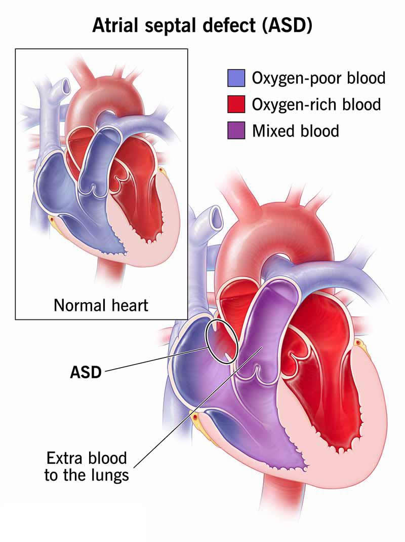 An atrial septal defect (ASD) is a congenital heart defect. It’s a hole in the atrial septum, the muscular wall between the two upper chambers (atria) of your heart. Small ASDs usually don’t need treatment. Larger ones may require percutaneous (nonsurgical) repair or surgery to lower the risk of serious complications.