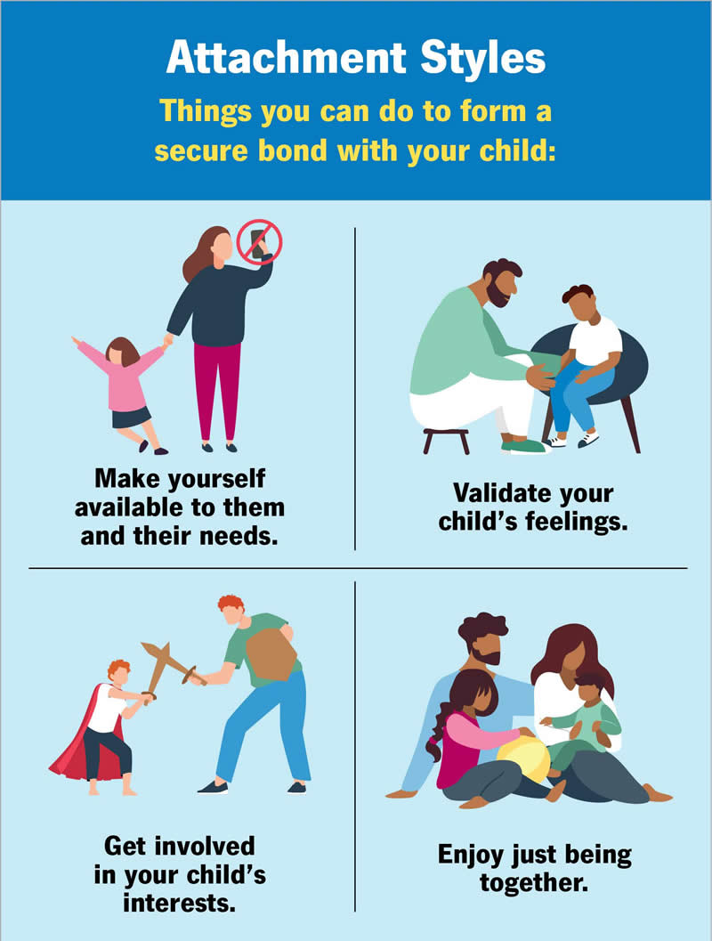 The bond you form with your child during their first 18 months can have a profound impact on the way they navigate relationships later in life. When interacting with your child, be consistent and intentional. Make sure they know you’re a safe person with whom they can share their feelings and emotions, big or small. Forming a secure attachment with your child is just one way to set them up for success in the future. To learn more about techniques that’ll work for you, talk to your child’s pediatrician.