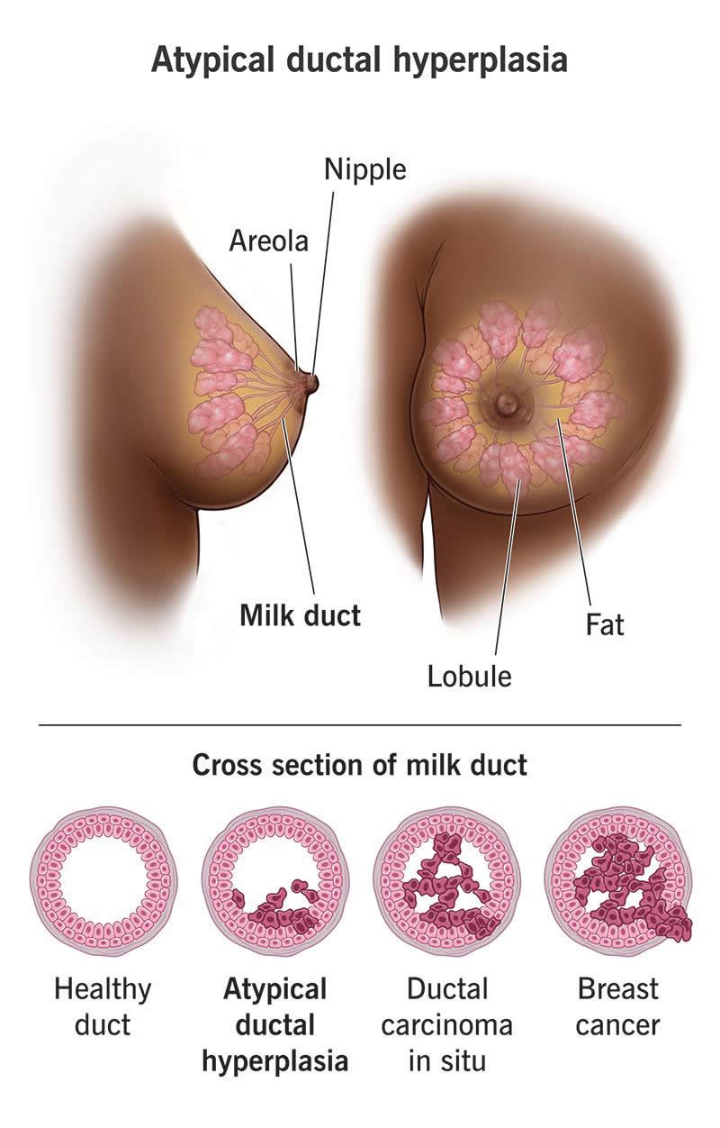Atypical ductal hyperplasia (ADH or atypia ductal hyperplasia) is when you have abnormal cells in the lining of the milk ducts in your breasts. Your milk ducts are small tubes that carry milk to your nipples. Typically, the cells in the lining of your milk duct appear lined up in two layers. With ADH, the cells are multi-layer and don’t line up. They appear disorganized or overgrown. The cells themselves are noncancerous (benign). But the cells share some features of ductal carcinoma in situ (DCIS), which is an early-stage breast (Stage 0) cancer. For that reason, ADH cells have a higher-than-average chance of changing into cancer.