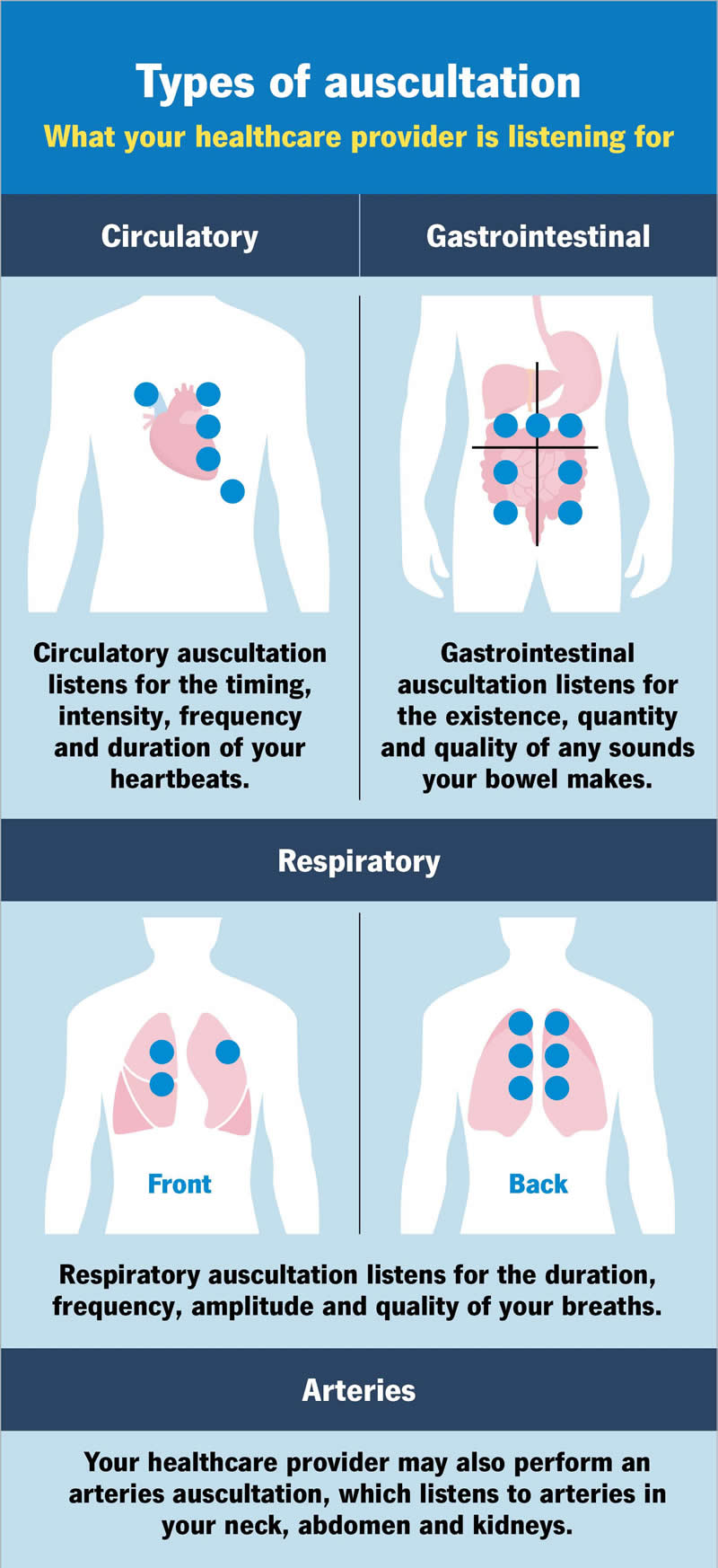 Your healthcare provider uses auscultation during routine physical examinations. They want to check the sounds of your circulatory system, respiratory system and gastrointestinal system. They’ll use auscultation to keep an eye on your overall health, or to confirm or rule out various medical conditions.