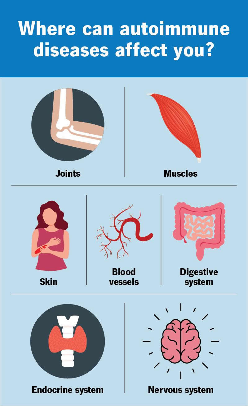 There are more than 100 different autoimmune diseases. They can affect almost any tissue or organ in your body, depending on where your immune system malfunctions, including your: