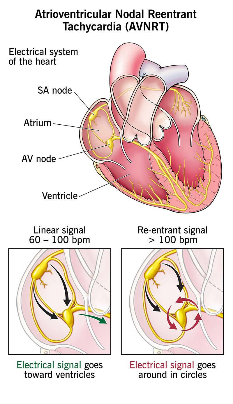 - Reentrant: Normally, electrical signals follow a set path through your heart. But with AVNRT, they tend to reenter a circular path in your AV node. This causes a fast heartbeat.
