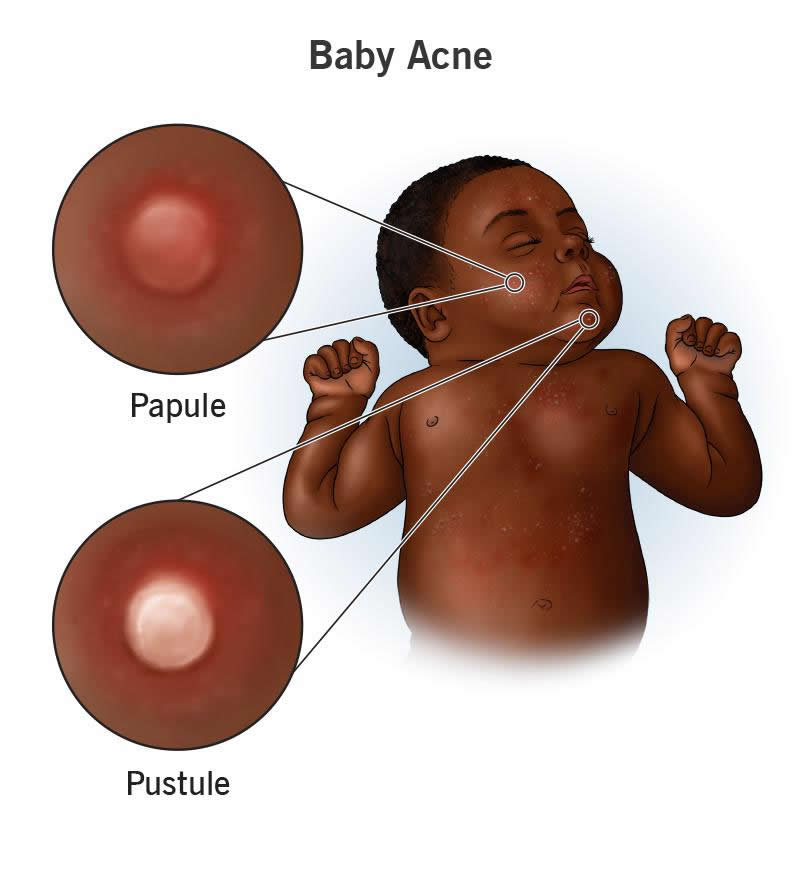 Providers suspect that baby acne is the result of hormonal changes that affect your newborn during birth or the first few weeks of their life. Hormones in the placenta can affect how your baby’s skin produces sebum. Sebum is an oily substance that the sebaceous glands in your baby’s skin make to protect their skin and hair. Too much sebum can clog pores and lead to acne.