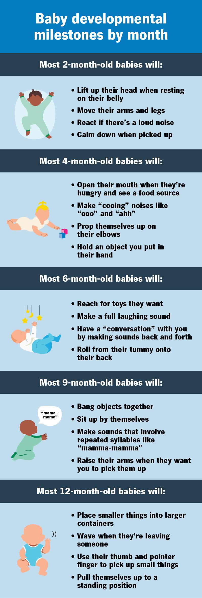 Your pediatrician will track your baby’s milestones at well-checks. They’ll do a physical exam and interact with your baby to see how they move, play and make sounds. These routine visits are also a chance for you to bring up any concerns about your baby’s development.