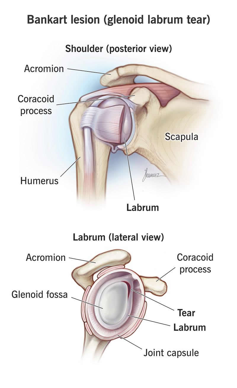 A Bankart lesion or glenoid labrum tear happens when your shoulder bone dislocates and tears the supportive tissues around it. A dislocated shoulder is a traumatic injury caused by significant force.