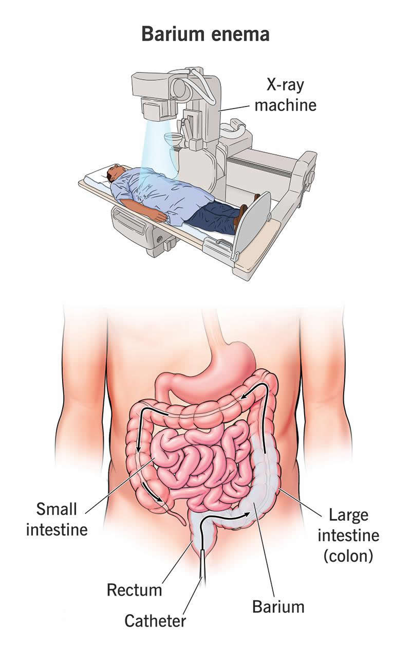 A barium enema (contrast enema or lower GI series) is a special type of X-ray for your large intestine. It involves filling your bowel with a contrast substance called barium, which makes the X-rays show up better. A healthcare provider inserts the barium into your rectum like an enema before taking pictures.
