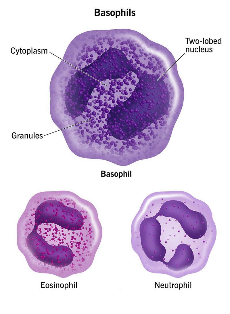 Basophils are a type of white blood cell in your immune system that help defend your body from allergens, pathogens and parasites. Basophils release histamine to improve blood flow to damaged tissue and heparin to prevent unwanted blood clots. Abnormal basophil levels may indicate various conditions, from allergic reactions to cancer.
